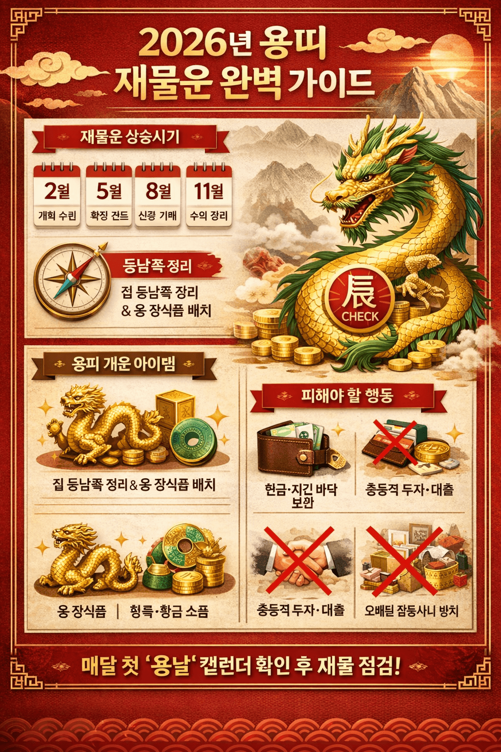 2026년은 보통 음력 설 이후(2026년 2월 17일 이후)부터 한 해 흐름을 본격적으로 보는 편입니다. 용띠 재물운을 끌어올리기 위해서는 집 현관을 기준으로 동남쪽 공간을 정리하고, 용(辰) 기운을 상징하는 소품을 과하지 않게 포인트로 배치하는 방법을 참고하는 경우가 많습니다. 또한 매월 용날(辰日)을 캘린더로 확인한 뒤, 투자나 사업처럼 중요한 결정을 내리기 보다는 점검/정리/확인 하는 날로 활용하는 방식이 부담이 적습니다.